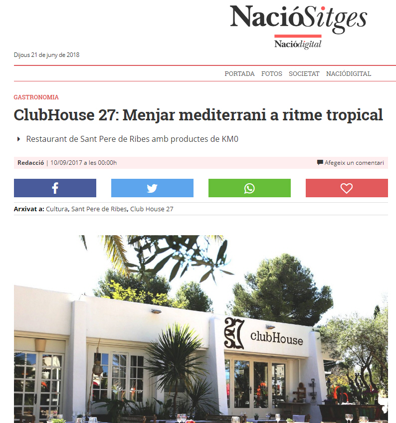 Data: 10 de setembre del 2017 Mitjà: Nació sitges Titular: ClubHouse 27: Menjar mediterrani a ritme tropical Restaurant de Sant Pere de Ribes amb productes de KM0 Link:https://www.naciodigital.cat/sitges/noticia/1861/clubhouse/27/menjar/mediterrani/ritme/tropical